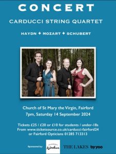 They will be performing works by Haydn, Mozart and Schubert, and tickets will be on sale from the Fairford Opticians and also via TicketSource, from 18th June.