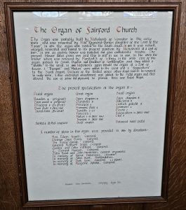The following is part of the information found on the framed description of the organ which is at the back of the organ, opposite the wardrobes for the choir robes.
