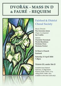 Fairford & District Choral Society will perform their next concert on Saturday 13 April at 19.30 at St Mary’s Church, Fairford. The concert programme is Dvorak Mass in D major and Faure Requiem. Our new conductor is Nia Llewelyn Jones and our accompanist will be Ian Crabbe. Soloists will be Charlotte Newstead (soprano), Nicole Boardman (Mezzo), Nicholas Drew (Tenor) and Nicholas Perfect (Bass). Tickets (£15 or £5 for under 18s) will be on sale in early March from members of the choir and Fairford Opticians.